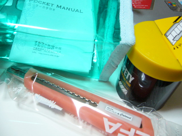 このカッターと刃を折れる丸いやつと緑のビニールケースのセットで300円。