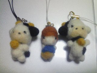 羊毛フェルトで作ったウシ君と女の子のストラップです。